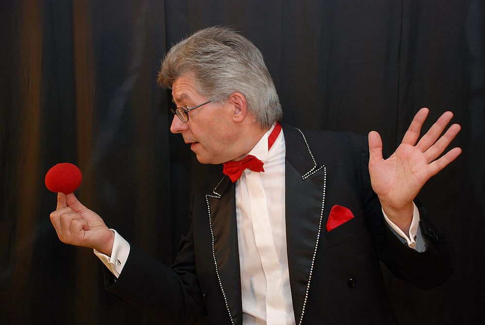 An verschiedenen Stellen kleine Zaubereien aus dem Zylinder oder der Jackentasche - je nach Publikum und Andrang. Auf jeden Fall sind „bunte Punkte überall“ garantiert.